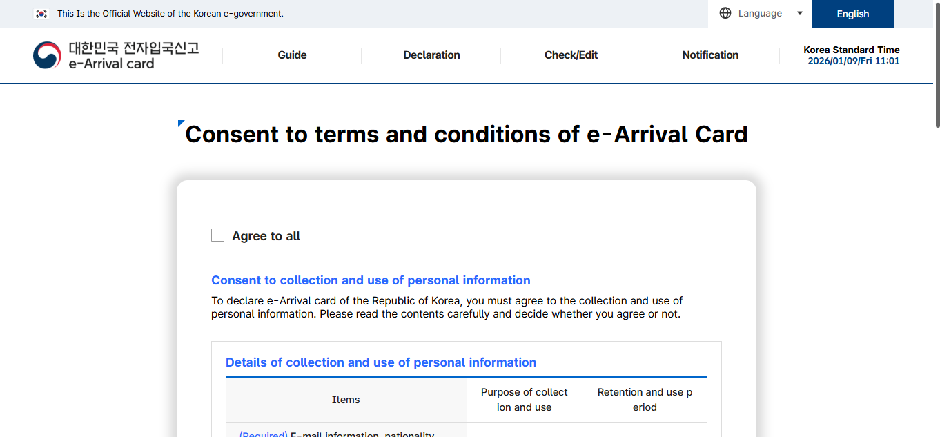 Bước 1: Truy cập web trên máy tính hoặc điện thoại: https://www.e-arrivalcard.go.kr/portal/main/index.d